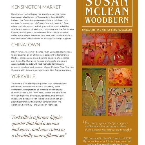 Susan, a Canadian artist, was raised and spent considerable time in Toronto, the Cobourg/Grafton area as well as Georgian Bay-Pointe au Baril. Many of her paintings are inspired by these locations. "Winter is a favourite season - being born in December must have influenced that...I have a feeling I entered this world on a snowy day. I love the snow...it's pristine beauty, the wonderful, crisp freshness of the air - as well as the quiet - you find only in winter." Her skaters, bathers, angels and dancers are all studies of movement and light, capturing the joyful exuberance of life ... "Joie de vivre". Her portraits reveal the spiritual elements of the individual and their unique character.